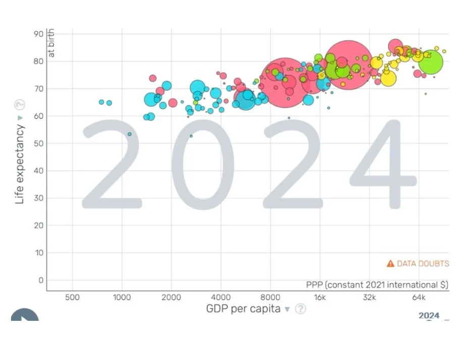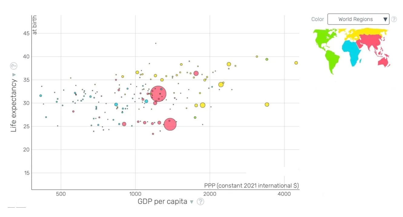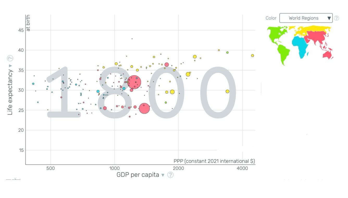 As you can see the countries that used to be labelled in the red have gotten a lot of wealth and they like expectancy has gone up since then. The distribution of where the blue is also scattered. You still see a lot of yellow dots inside but they are not the only ones.