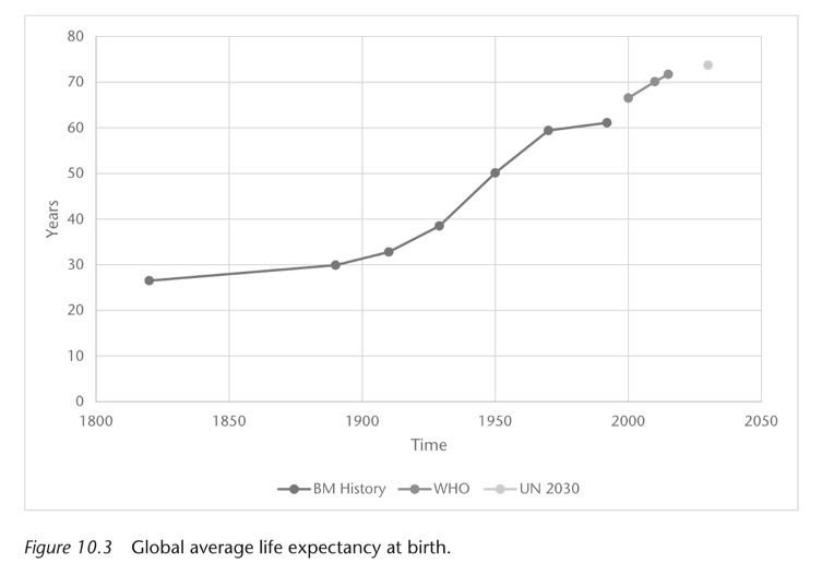 I’ve linked sources and you can check the dat out for yourself. Average life expectancy at birth from 1820 to 2015 using data compiled by Bourguignon and Morrisson (2002) and theWorld Health Organisation (2018). The United Nation’s (2015) forecast of life expectancy in 2030 is also included.